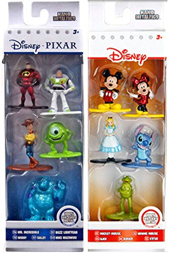-. Feature : Disney Collection fun Set with Mini figures 2-Pack / Nano Metalfigs Disney 5 Pack A Jada Toys Mini Metal Figures / Mickey Mouse / Alice in Wonderland / Minnie Mous / Muppets Kermit the Frog / Stitch / Disney / Pixar Nano Metalfigs 1.5-Inch Diecast Figure 5-Pack / Mr. Incredible, Buzz Lightyear, Woody, Mike Wazowski & Sulley