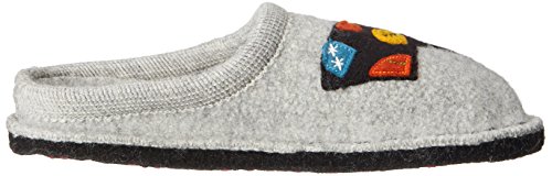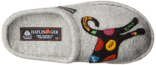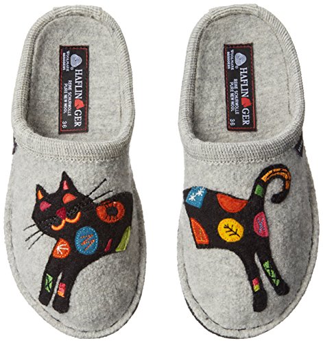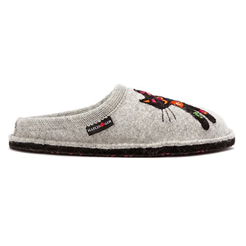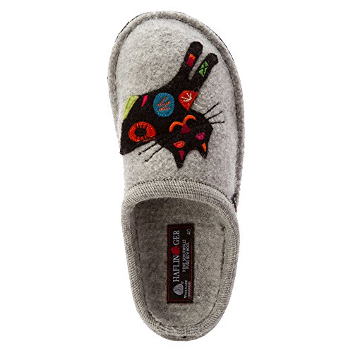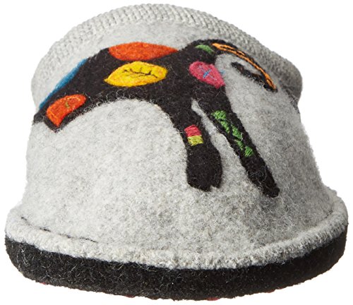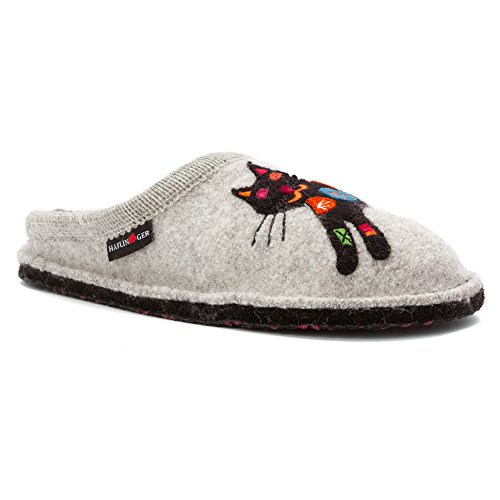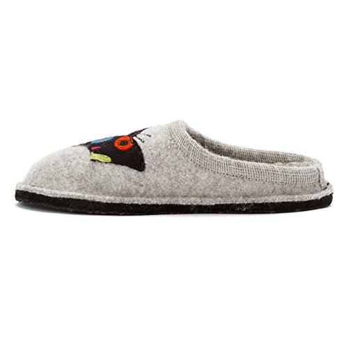 Studio : Haflinger Footwear Publisher : Haflinger Footwear Binding : Shoes Product Description When those days call for a casual slipper, slide on these women's Sassy Slippers by Haflinger. These cozy slippers are made of a soft, natural 100% boiled wool upper, while the sock liner conforms to your foot for unbeatable glove-like comfort. The outsole is composed of double felt layers for durability, and the padded footbed design guarantees an easy transition between work and rest. Soft, natural 100% boiled wool in silver hue Yarn applique of a colorful kitten adds a sassy touch Natural latex arch support Double felt outsole Padded footbed ½' heel Breathable material 0
