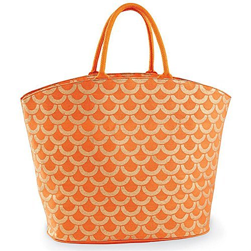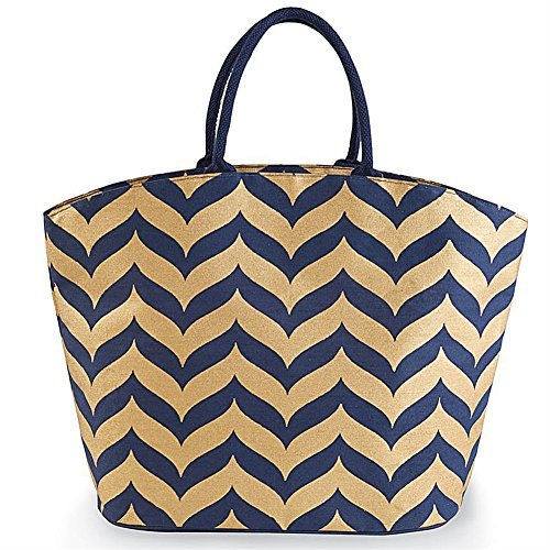 Juco/cotton blend tote has all-over metallic gold print and cotton web handles. Laminated wipe-clean interior and interior pocket.