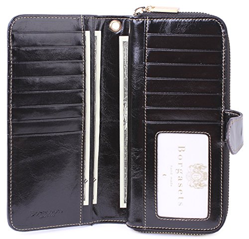 -. Feature : Made of high quality cowhide leather, the oil wax leather makes the purse more luxury. Come with light gold hardware and durable polyester lining. / Great size and good amount of compartments.14 credit card slots and 1 photo window, 2 full length pockets, 2 zipper coin change pouch can also put bills in it. Easily hold your Samsung Galaxy Note, Iphone6s, Iphone6 Plus. Zipper designed for the safety of your properties / Size info: (L)7.5" x (H)3.6"x (W)1.2" inch / Attention:Borgasets is an US registered trademark,unauthorized sale without permission,we will investigated for legal responsibility. / Equipped with Borgasets exquisite gift boxes, is the best choice for personal use and gifts
