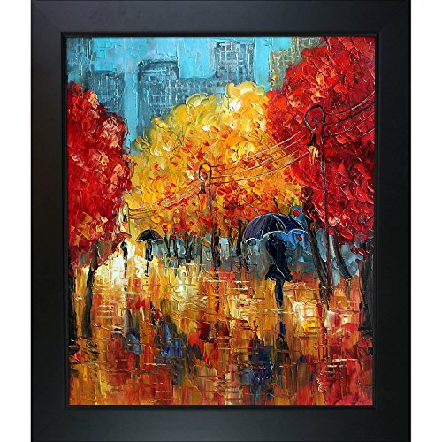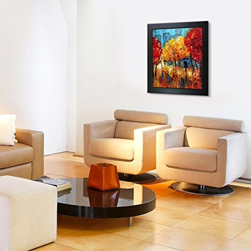 Street is a vividly colorful image of an autumn abstract city scape using expressive color and line. Enjoy the energy this hand painted oil canvas brings to any room of your house. Justyna Kopania is from Warszawa, Poland. In her words when she paints she tries to show the 'world', which could be seen by looking at reality that surrounds us, from another perspective, unusual, remote, sometimes through the eyes of the child, sometimes music, composer, or someone who looks lichen on the sea, the moon, the sky and the stars, the river looks out the window and looks out into the street. Walking down the street looking at people's faces. In rain, snow or fog. Perhaps the world that surrounds us really is quite different than we perceive it every day. Frame Description: New Age Wood Frame - Black Finish.Feature