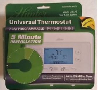 -. Brand : Hunter Fan Company -. EAN : 0049694421241 -. Feature : Easy 5 minutes install / Compatible with most furnaces and cooling systems / No anchors or drilling required / Filter change indicator / 2 AA batteries required (not included). Model # 42124. -. Label : Hunter Fan Company -. Manufacturer : Hunter Fan Company -. Model : 42124 -. ProductGroup : Home Improvement -. ProductTypeName : HOME_LIGHTING_ACCESSORY -. Publisher : Hunter Fan Company -. Studio : Hunter Fan Company -. Title : Hunter Digital Non-Programmable Thermostat Hunter Fans -. UPC : 049694421241