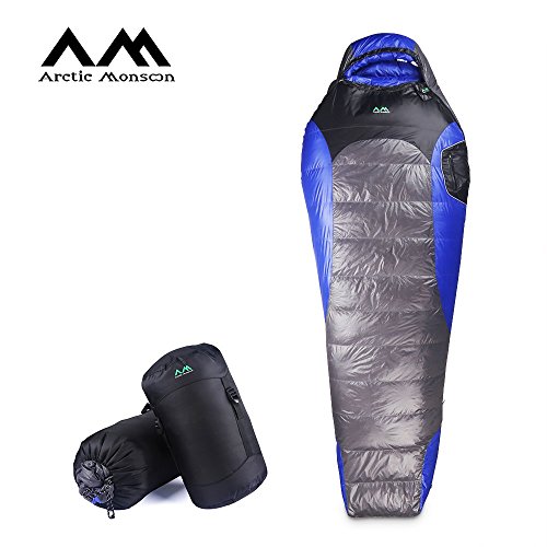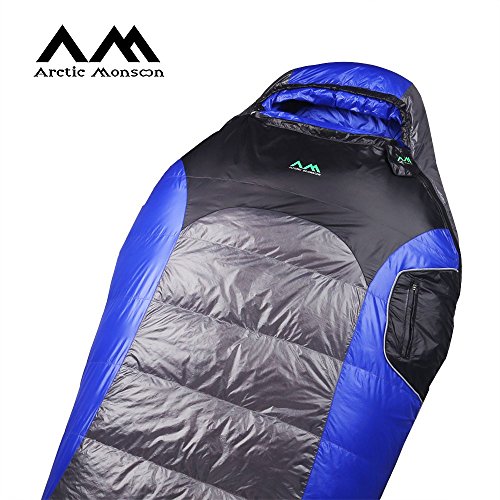 DOWN MUMMY SLEEPING BAG, ARCTIC MONSOON, 23F- 50F FOR 3 SEASON, ULTRALIGHT AND COMFORTABLE CAMPING COMPANION, 83* 32* 20 INCH, BLUE