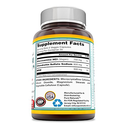 THREE ESSENTIAL JOINT HEALTH COMPOUNDS IN ONE EFFECTIVE FORMULA Pure Naturals proprietary formula combines 750 mg of Glucosamine, 600 mg of Chondroitin and 500mg of MSM in a 2 capsule serving formula to support joint health and flexibility