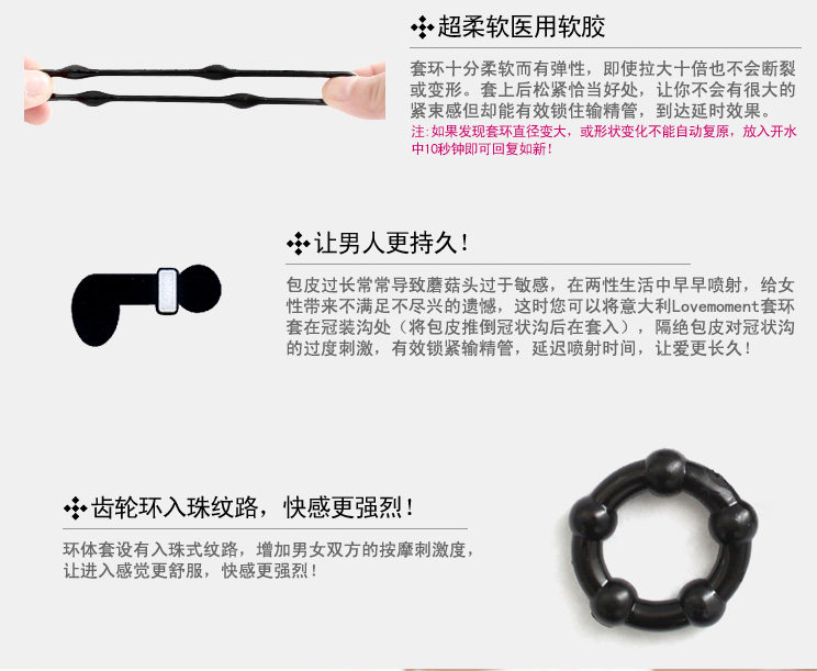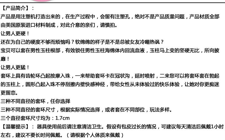 Gear ring on the collar has raised massage into beads, a collar card to help Coronal, delay spray, and secondly, you can set the collar on the erection of Yuzhu, round bumps into beads constantly scraping rub the inner wall of the pleasure nerves, bringing women never experienced the joy of experience, so you are more obsessed with her more nostalgia.