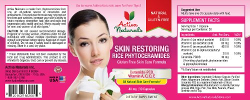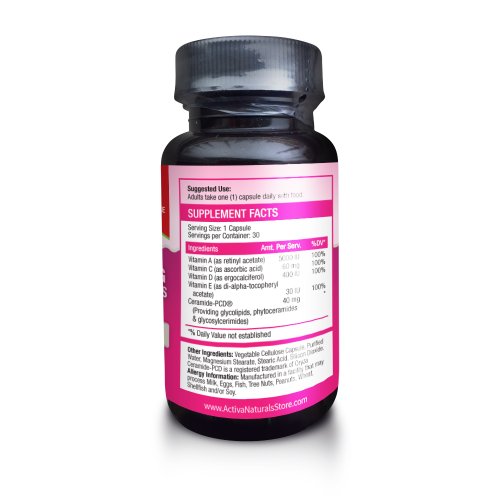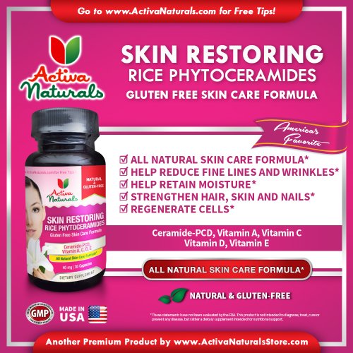 - Feature : Natural Facelift - Gluten-Free Phytoceramides Skin Formula is an innovative product from Activa Naturals that aims to Help Both Men and Women Structural Integrity of the Skin for a Smoother and Softer Skin Look - Clinical Study has Proven that Phytoceramides Works with Skin Cells to Rebuild & Rejuvenate Skin from the Inside Out / Healthy Skin - If You Take it as directed, Cracked and Damaged Skin is Moisturized - May Help to Reduce Fine Lines After 4-6 Months - Our Comprehensive Formula Provides the Recommended Daily Allowance of the Powerful Antioxidants Vitamin A, C, D and E to Your Skin to Minimize Damage to Cells Caused by Free Radicals / How It Works - Ceramides Strengthen cells, Allowing Each to Lock in More Moisture - Phytoceramides Supplement Helps Replenish Ceramides Making Your Cells Stronger Resulting in Smoother and Softer Skin / Easy To Use - Activa Naturals Premium Gluten-Free Phytoceramides Skin Formula is Further Enhanced with the Powerful Antioxidants Vitamin A, C, D and E to Provide Daily Essential Vitamins for the Health & Beauty of Your Skin by Orally Taking 1 Capsule Every Day! / TOP PREMIUM QUALITY - Phytoceramides Skin Supplement by Activa Naturals Contains Only Pure and Authentic Ingredients - USA MADE following Strict GMP Manufacturing Guidelines - FDA Registered Facility to provide you the Absolute Best Revolutionary Approach to Skin Care - 30 Capsules for 30 Days - SPECIAL LAUNCH PRICE FOR A LIMITED TIME ONLY!!!
