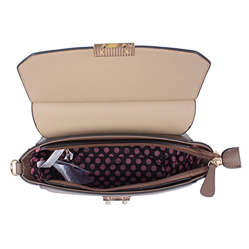 The Nikky Criselda Satchel is Sleek, chic and durable enough to handle everything you carry on the daily. Exterior Features: Made of high quality eco-leather. Push lock closure with zip back pocket. Gold, tarnish free hardware. Signature Nikky Logo nameplate on front. Sleek top handle with 4" drop. Detachable and Adjustable crossbody strap extending from 44"-50". Interior Features: Second interior zipper closure. Large main compartment with interior zip and slip pockets. Signature Nikky polka dot nylon lining. For cleaning, wipe with damp cloth.Feature