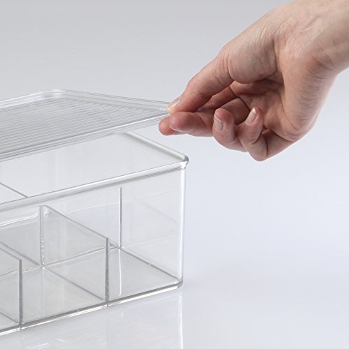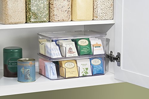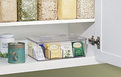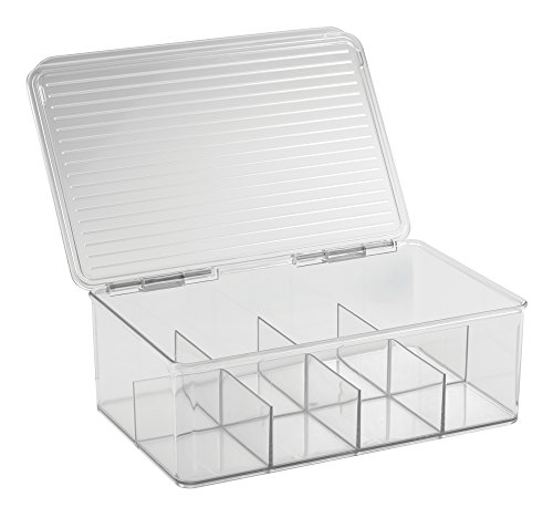 mDesign's Tea Box is the perfect solution to a messy pantry! This stackable box features a hinged lid & has 8 compartments to store up to 100 tea bags. Made of durable, clear plastic for visibility.