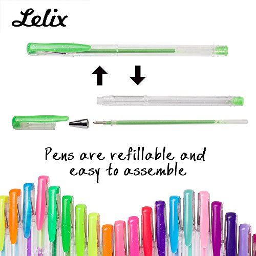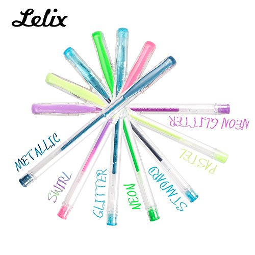 - Lelix 320 gel pen set is a combination of 160 assorted colored gel pens whose color effects include: neon, neon glitter, glitter, pastel, metallic, swirl and standard, and 160 refills matching the 160 gel pens.
