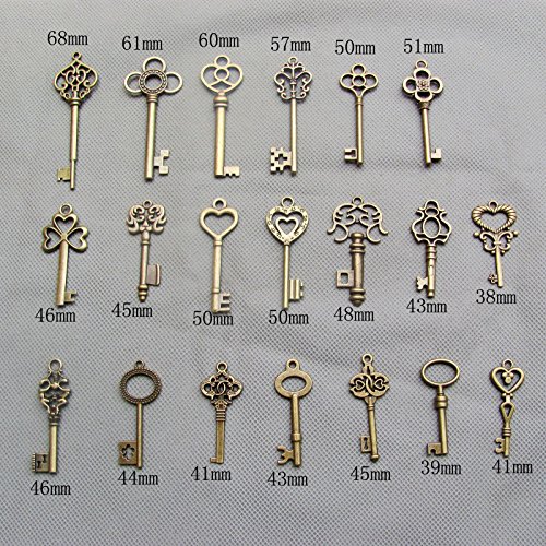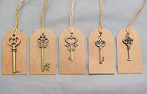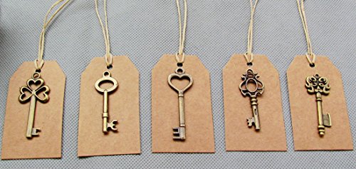 SL crafts Mixed Set of 20 Skeleton Keys & 20 pcs Kraft Tags Antiqued Brass Bronze Charms Pendants Wedding favor 38mm-68mm