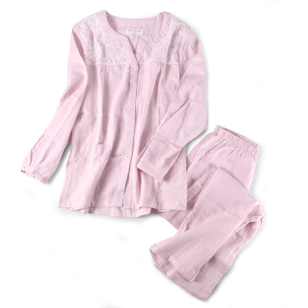 (Diosun) Diosn Pajamas Women's Top and Bottom Long Sleeve Wear Double Gauze Plum Embroidery Lace Front Open Cotton 100% Spring, Fall Winter Women Ladies' / Travel