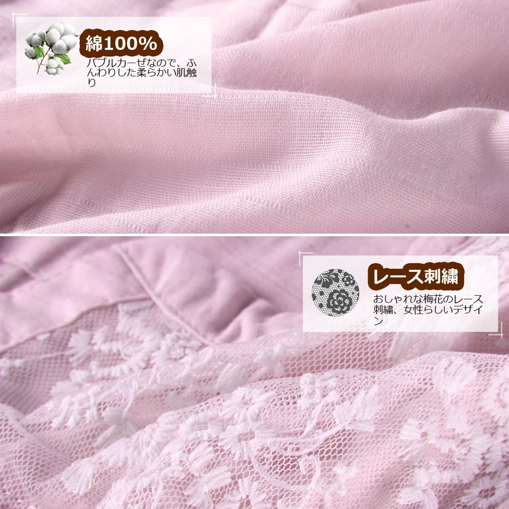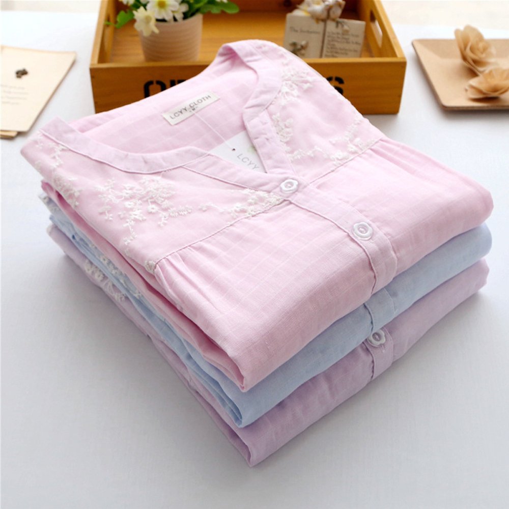 1, Material: 100% cotton (double gauze) It is a very fashionable pajamas with stitching a beautiful and shiny lace on the chest of the outerwear, embroidered plum blossoms on top