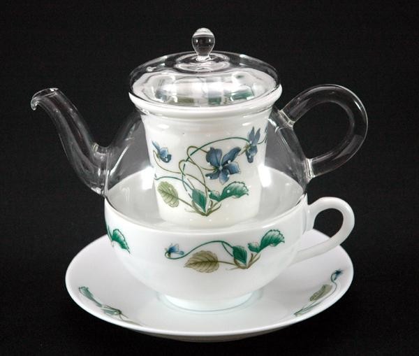 | 1人用ティーポットとティーカップがセットで、カップとポットが重なる形状が特徴の「ティーフォーワン」。ガラスのティーポットには陶磁器の茶こしをセットしました。ガラスの透明性と陶磁器のあざやかな絵柄が、上品でおだやかな時間を演出します。おもてなしやギフトにも最適☆ |
