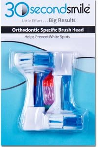 The Orthodontic Soft Brush Head is specifically for anyone with dental braces. It has a special bristle configuration to not only clean the teeth and gums like our standard brush heads, but the added row of angled bristles clean the hard to reach areas around dental brackets. The result is peace of mind that these difficult areas are being cleaned automatically. That is the simple solution to preventing white spots associated with dental brackets.
