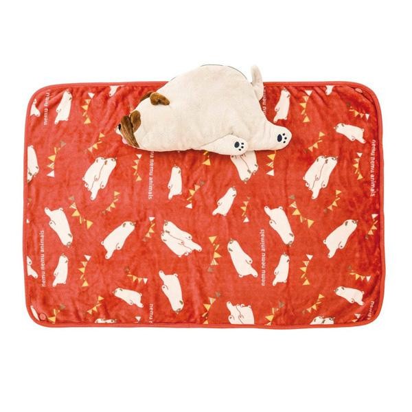| 滑らかな肌触りのフランネル生地にねむねむたちをプリントデザインしたブランケットクッション。カバーの中にプリントデザインのブランケットが入っています。ブランケットはボタンが付いているのでひざ掛け・ボレロ・ポンチョとして3通りに使えて便利です。カバーにブランケットを入れるとクッションとしてもお使いいただけます。 |