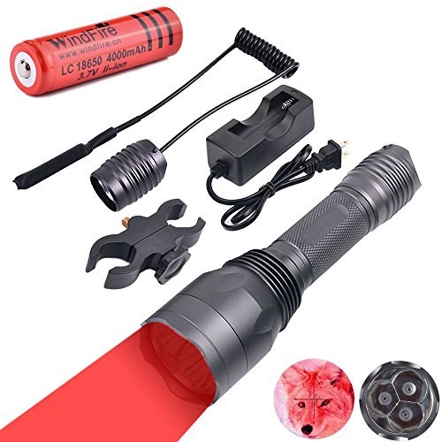 WindFire S10 300 Yards 650 Lumen 3pcs Red LED Long Range Hog Predator Varmint Red Hunting Gear Tactical Flashlight Hunting Kit with Scope Mount, Pressure Switch, Rechargeable Battery and Charger