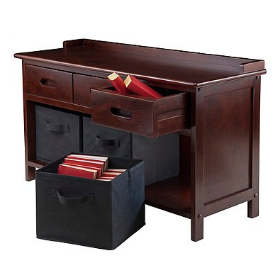 -. Feature : The Winsome Trading Adriana Storage Bench is a great addition to a playroom, mud porch, entryway or bedroom / Top bench features easy-access storage beneath the seat, 3 wood drawers, 3 foldable fabric baskets / Solid wood, MDF, rubber wood, and veneer construction in an antique walnut finish / Wipe clean, Easy assembly required, Weighs 47 lb / Measures 37.9" L x 14.17" W x 22" H overall, Each basket measures 10.97"L x 10.06" W x 9" H
