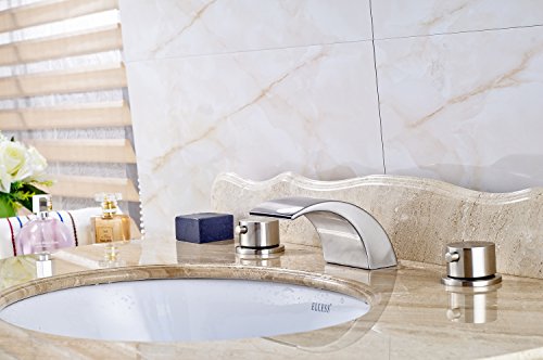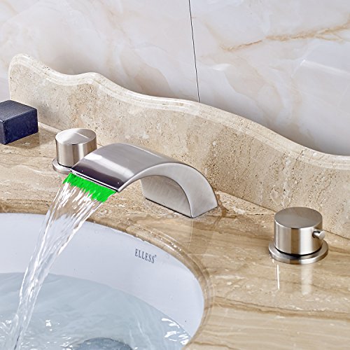 -. Brand : Rozin -. Color : Brushed Nickel -. Feature : Factory Direct sales,Delivery within 7-10 days / Deck Mounted 3 Holes / Cold and hot water / LED works by water flow,No battery is needed / Fit for 8-inch Widespread Sink at least -. Label : Rozinsanitary -. Manufacturer : Rozinsanitary -. Model : RZ60919181 -. MPN : RZ60919181 -. PartNumber : RZ60919181 -. ProductGroup : Home Improvement -. ProductTypeName : PLUMBING_FIXTURE -. Publisher : Rozinsanitary -. Studio : Rozinsanitary -. Title : Rozin LED Light Waterfall Spout Bathroom Sink Faucet 2 Round Knobs Vanity Basin Mixing Tap Brushed Nickel