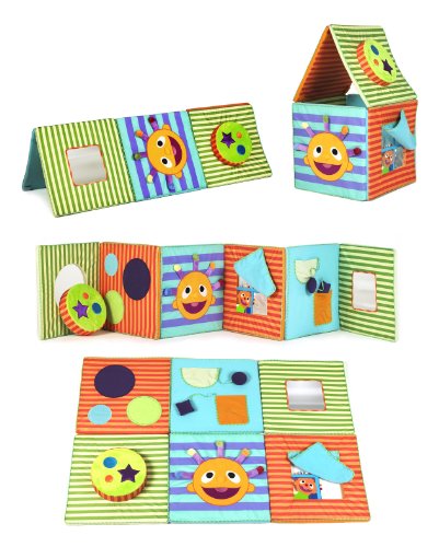 From the gentlest tummy time activities to the most imaginative toddler time explorations, this unique adventure play mat easily transforms into an activity playhouse to provide an ever-growing interactive learning environment for every baby. As shown in flat position, this soft and stimulating mat measures 3' x 4.5'.With its bold colors, range of textures, and six large 18" x 18" different, engaging and simply re- configured discovery panels, this play mat sets the skill-developing scene for countless learning adventures.Tactile explorations.. mirror play...push-pull games...inside, outside, over and through...open, close...and an exciting range of peek-a-boo variations are just a few of the games you can play as you exercise your baby's motor, social and thinking skills.Whether you set out the discovery panels as a mat, in a row, as individual play stations, as a "tunnel" or a "house," a simple change in the position of any panel—from left to right, top to bottom, inside to outside, first to last—will provide you and your baby with new games to play and opportunities to learn. Panels attach easily with Velcro tabs. Includes handy zippered storage bag. For ages 3-36 months.Feature