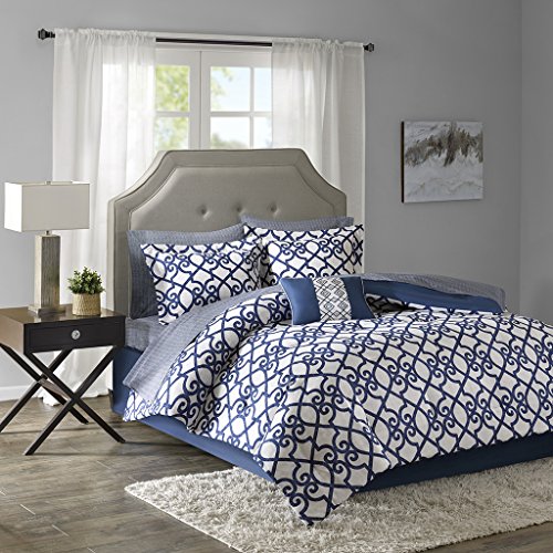 - The Madison Park Essentials Daven Complete Bed Set provides a contemporary update to your décor. The bold blue in this decorative ogee pattern is accentuated by the texture in the print. A deep blue sheet set carries over the printed texture and one embroidered decorative pillow puts the finishing touches on this updated collection.