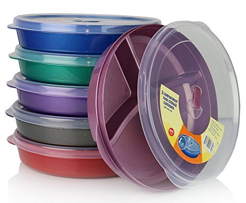 (Set of 6) Microwave Food Storage Tray Containers - 3 Section / Compartment Divided Plates w/ Vented Lid