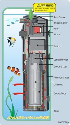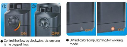 This is JUP-22 UVC sterilizer, an upgrade from the older model JUP-01 by SUNSUN with new feature of ADJUSTABLE FLOW RATE. It will allow the user to control how much water and how long to be treated by this unit to maximize the sterilizing effect. It also comes with an easy-maintenance feature making routine cleaning work more convenient. UV-C lamp helps neutralize harmful micro-organisms and free-floating algae Preassembled aquarium UV sterilizer requires no additional pump or plumbing Built in UV-C lamp ballast and single power cord mean streamline and clutter-free installation and operation. The newly designed pre-filter and quartz sleeve simplify routine maintenance necessary for optimal UV performance. The amazing, submersible Submariner UV sterilizer/clarifier allows simple and effective UV control. Compact and versatile units are ready to install - no additional tubing or circulation pump required! The built-in pump directs waterborne organisms past the UV-C lamp for clean, clear aquarium water. Install in vertical or horizontal position right in your aquarium or sump. Great for both fresh and salt water aquarium. Feature: • Adjustable Flow Rate (NEW FEATURE) • Easy maintenance design (NEW FEATURE) • UV Power: 9 Watts (G23 Base) • Pump Power: 8 Watt • Max Flow: 211gph • Max Tank Size: 75 Gallon • 9W UVC Light Bulb Included DIMENSION: 3" x 2.5" x 12.5" INCLUDES: UV unit with built-in pump UVC Light Bulb Suction cup mounting brackets Air tubingFeature