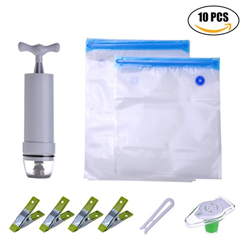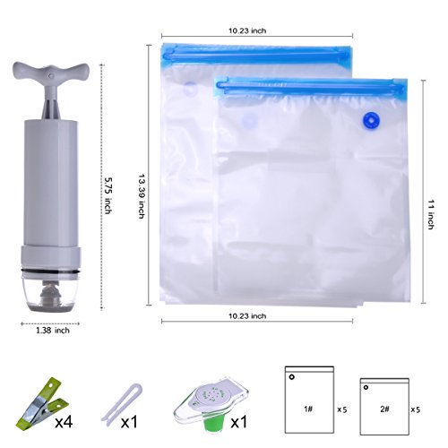 ✔Economical Sous Vide Essentials Kit-Includes 1 hand pump, 10 vacuum sealed bags with 2 different sizes(26x28cm)&(26x34cm), 4 secure clips and 2 bag sealing clips, and a FREEgift: 1 wine bottle stopper. All in one box.