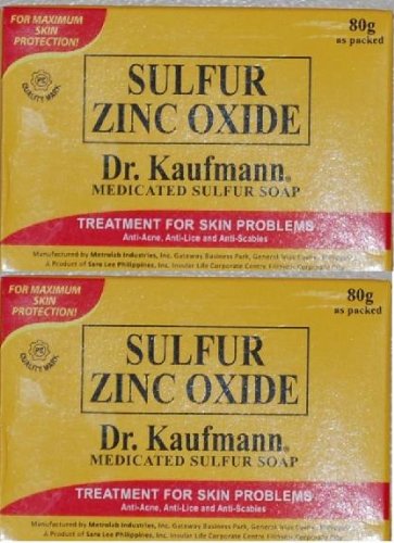 -. Feature : 2 BARS of Authentic Dr Kauffman Medicated Sulfur Soap / Has Sulfur Zinc Oxide that helps relieve common skin problems while keeping your skin healthly. / Safe for use by both adults and children at least 3 years of age / Product of the Philippines by Unilever