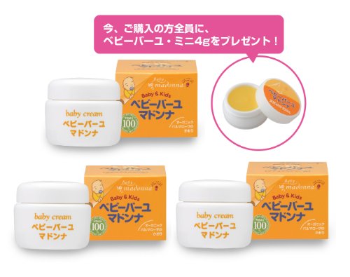 -. Binding : Baby Product -. Brand : ベビーマドンナ -. EAN : 4545494002506 -. Feature : 原産国:日本 / 内容量:25g・3個セット+ベビーバーユ・ミニ4g(病院専売品/1個 270円)、季節限定オーガニックスキンケア・サンプルをプレゼント!(但し、購入個数に関わらず1回のご注文で1個のプレゼントになります。ご了承ください。) ≪送料無料≫ / 天然100%ナチュラルクリーム(無着色・無香料・防腐剤無添加) / 2002年発売以来のロングセラークリーム! / 全国の産科のスキンケア指導で使われています。/大人の方にも好評です / 左の画像をクリックすると、英語用、中国語(簡体字)用パンフレットをご覧頂くことができます。 / ◆Ordered items are shipped on the same day. However, if you have provided your delivery address to the Forwarding Service, they may take several days to complete international shipping. For inquiries regarding any delayed deliveries handled by the Forwarding Service, please check with them.◆敝公司的商品为当天发送,但如果收件地址为转运商,则从转运商送至海外需要数天时间。如未收到货,请您联系转运商咨询详情。◆请注意伪造品! 宝宝马油Madona(日语名 ベビーバーユマドンナ®)是2002年由本公司发售并有登录商标的商品。最近,有本公司的[宝宝马油]的伪造品,购买时请留意商品名并确认(日语名 ベビーバーユマドンナ®)。 -. IsAdultProduct : 0 -. Label : マドンナ株式会社 -. Manufacturer : マドンナ株式会社 -. MPN : 250 -. PartNumber : 250 -. ProductGroup : Baby Product -. ProductTypeName : BABY_PRODUCT -. Publisher : マドンナ株式会社 -. Studio : マドンナ株式会社 -. Title : ベビーバーユマドンナ 25g・3個セット+ベビーバーユ・ミニ4gをプレゼント!
