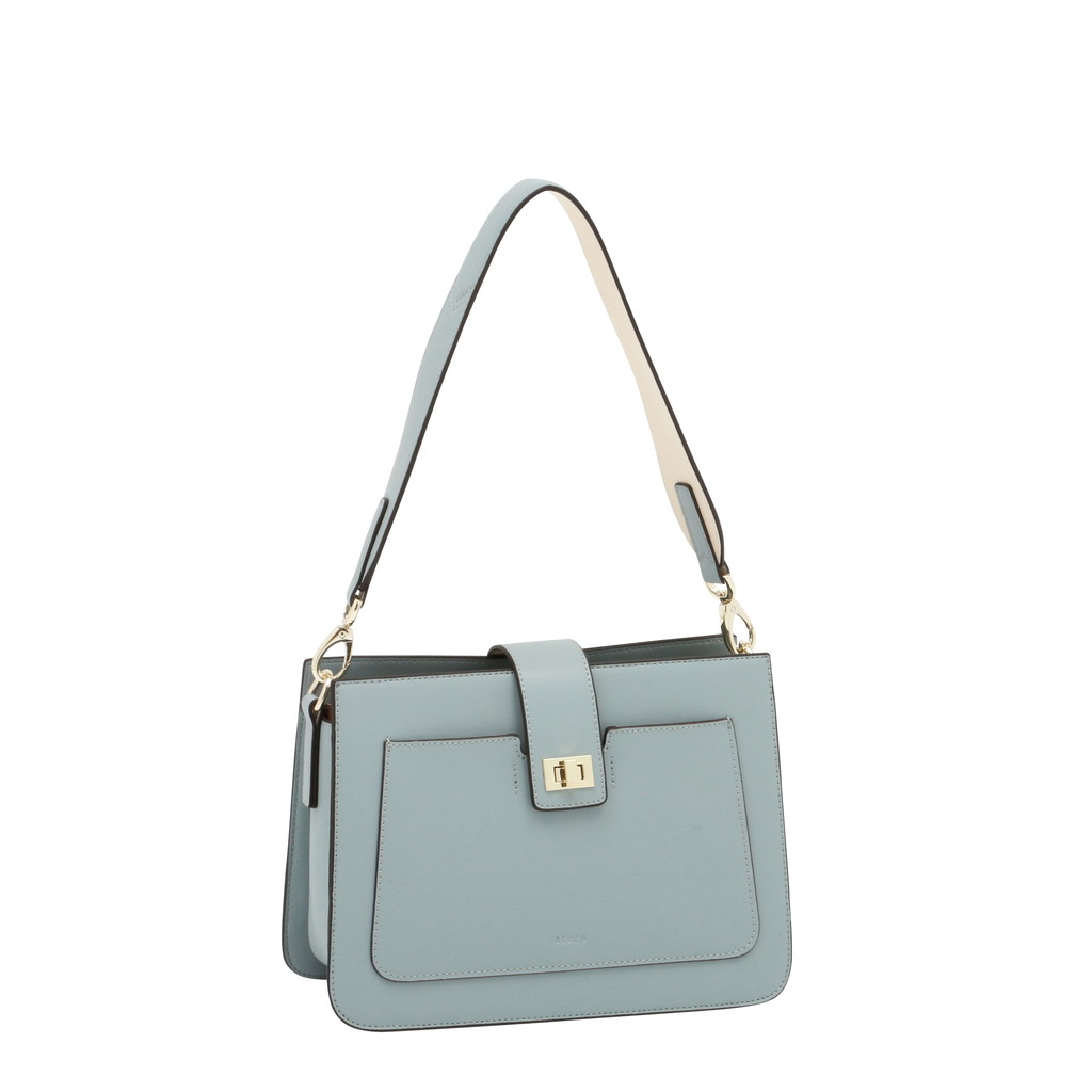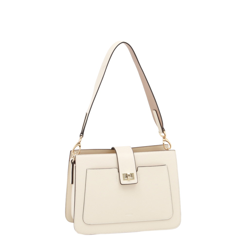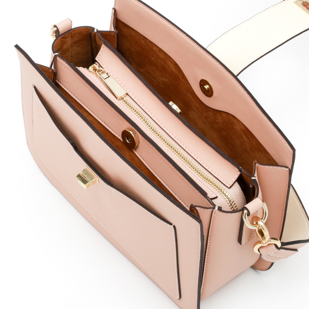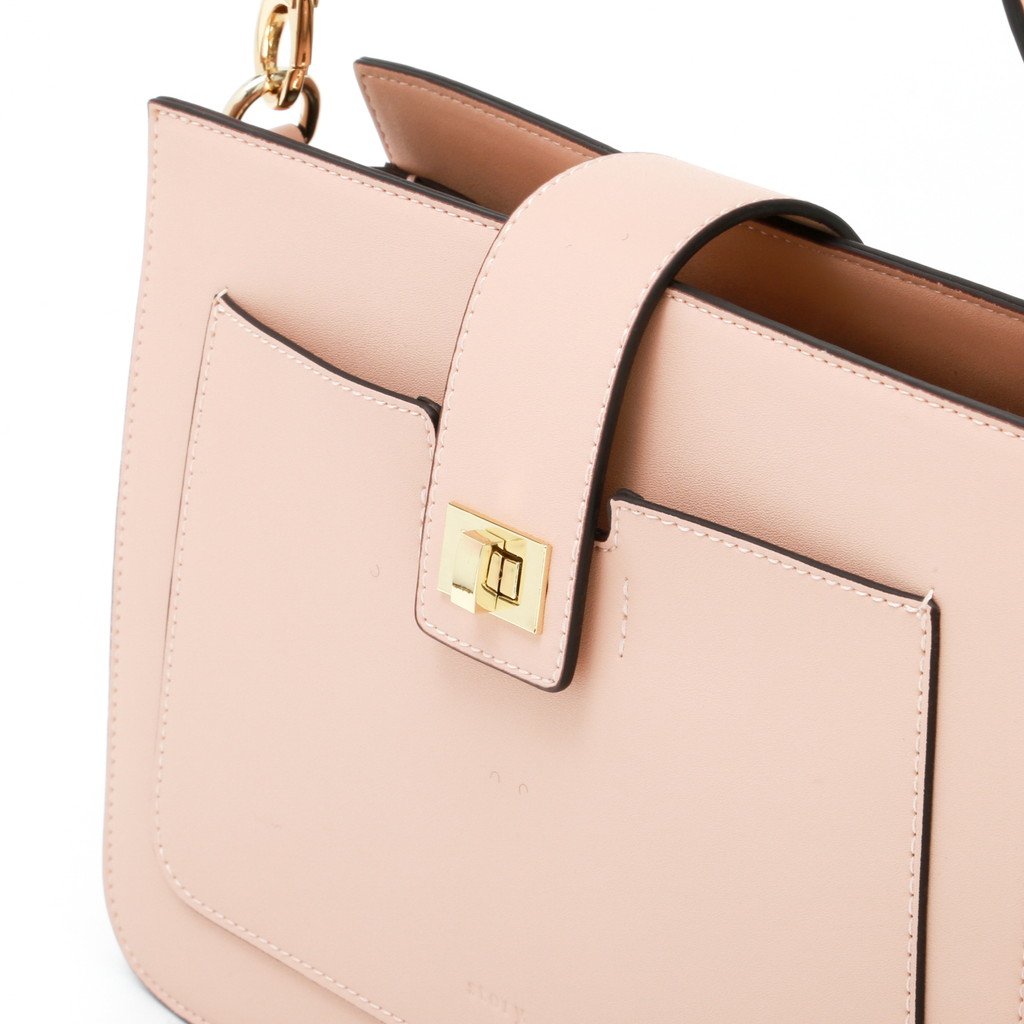 コンパートメントされた内部や肩になじみやすいワイドなショルダーなど実用性に優れた理想的なハンドバッグ。2トーンのワンハンドルはフェミニンな印象を放ち、コーディネートに華を添えます。なめらかなで艶のある表面とは対照的にライニングにはスウェード加工のポリエステルを使い、リュクス感を加えています。