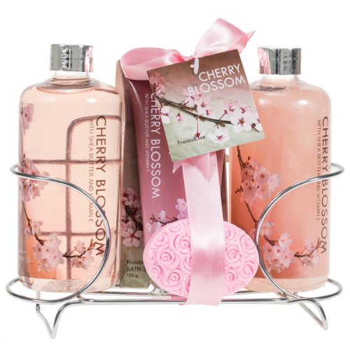 -. Binding : Misc. -. Brand : Freida Joe -. Color : stainles steel/ pink -. Department : Beauty -. EAN : 0736983001092 -. Feature : Stainless Steel Caddy Express your friendship with a twin cherry-themed gift set! A chrome caddy provides a sleek and modern holder, for the Chrome Cherry Blossom Fragrance Spa Set. This multi-purpose holder can be used to hold soaps and lotions in a powder room or bathroom. Gift recipient will appreciate the set holder, in addition to the fragrances! / Contents: 300 ml shower gel 10oz 300ml bubble bath 10oz 90ml body lotion 120g bath salt Pink flower soap Enriched with Shea butter and vitamin E / Color: Pink / About This Fragrance: With the warmth of late sP.R.Ing and soft pink flower buds; the delicate aroma of the Cherry Blossom, the national flower of Japan, hints of colorful kimonos and tea served in delicately patterned 'Sakura' cups. / Treat that special person to the most luxuriously indulging bath experience. -. IsAdultProduct : 0 -. Label : Freida & Joe -. Manufacturer : Freida & Joe -. Model : FJ-42 -. MPN : FJ-42 -. PackageQuantity : 1 -. PartNumber : FJ-42 -. ProductGroup : Beauty -. ProductTypeName : BEAUTY -. Publisher : Freida & Joe -. Studio : Freida & Joe -. Title : Cherry Blossom Spa Gift Set in Stainless Steel Caddy -. UPC : 736983001092