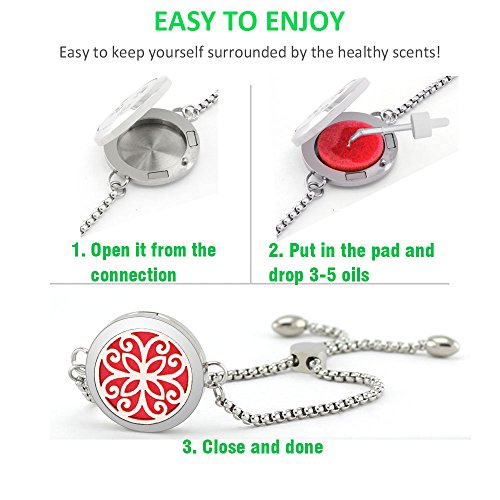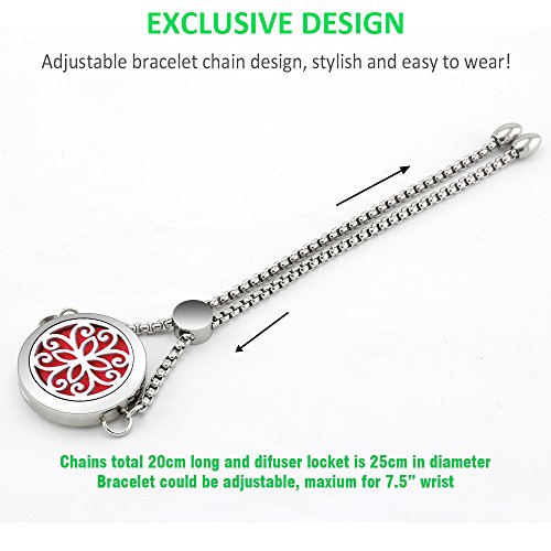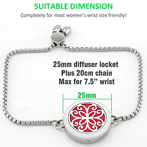 - You will get an essential oils diffuser bracelet with adjustable design! 25mm Exquisite pattern diffuser locket + 20cm adjustable stainless steel wristlet + 17mm felt pads, total only 25g weight and never feel tired even for long time wearing.