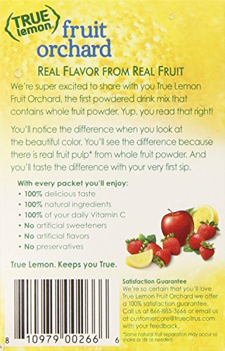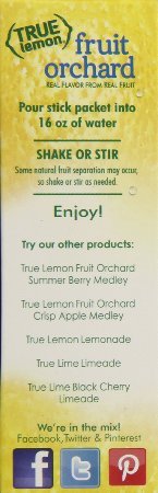 True Lemon Fruit Orchard is the first powdered drink mix that contains whole fruit powder. Yup, you read that right! You'll notice the difference when you look at the beautiful color. You'll see the difference because there is real fruit pulp from whole fruit powder (some natural fruit separation may occur, so shake or stir as needed). And you'll taste the difference with your very first sip.Feature