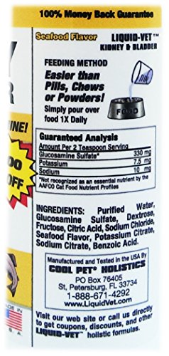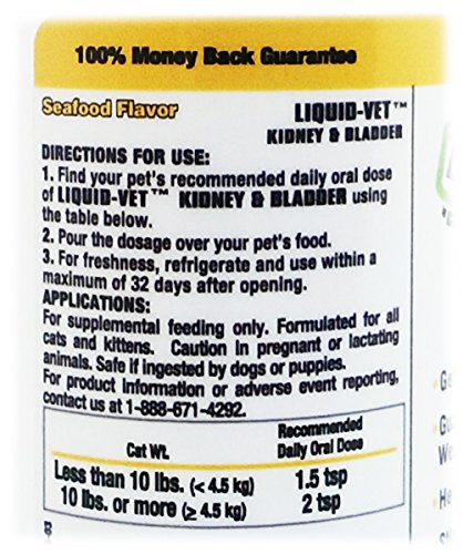 -. Feature : GLUCOSAMINE AND ELECTROLYTES: Our fast acting Cat Kidney and Bladder Formula is the only solution with these important ingredients that helps balance kidney potassium levels and protect the urinary tract lining. This formula is exceptional at providing kitties with the fluids and electrolytes they may need due to recent surgeries or sickness / DIRECTIONS FOR USE: To use, first find your cat's recommended daily oral dose of Liquid-Vet Cat Kidney and Bladder Formula from the table located on the bottle. Then, shake thoroughly and pour the recommended dosage over your cat's food using the attached dosage cap. For freshness, refrigerate and use within a maximum of 32 days after opening / ASSURED QUALITY: At Liquid-Vet we use only the best human pharmaceutical grade ingredients in our formulas. Plus, not only do we manufacture at our own plant located in the U.S.A., but we source all our materials from U.S.A. based suppliers. For us, quality control is our ultimate P.R.Iority and we support that claim with a 100% no-questions-asked money back guarantee on all products / EASIER THAN PILLS: Every cat owner has gone through the rigmarole of trying to get their pet to eat or swallow chews and sP.R.Inkles, only to have them crushed up and spit out. Some felines are so keen that they can sniff out medication from a mile away, and refuse to take food with medication altogether. Our joint aid employs a "pour over" feeding method, allowing you to simply mix it into your cat's favorite food. With a delicious seafood flavor, you won't have to worry about your cat not effectively taking their medicine / SPECIFICATIONS: Package includes (1) 8 fl. oz. Seafood Liquid-Vet Cat Kidney and Bladder Formula bottle. Formulated for all cats and kittens. Use caution when giving to pregnant or lactating animals. Safe if ingested by dogs or puppies. For product information or adverse event reporting, contact us at 1-888-671-4292