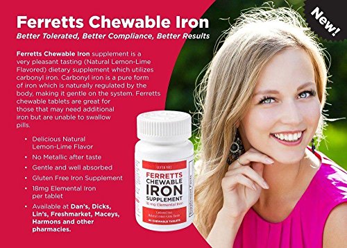 Studio : Pharmics Publisher : Pharmics Binding : Health and Beauty Product Description Ferretts chewable iron supplement is a very pleasant tasting (Natural Lemon-Lime Flavored) dietary supplement that utilizes carbonyl iron. Carbonyl iron is a pure form of iron that is naturally regulated by the body making it very gentle on the system. Ferretts chewable tablets are great for those persons that may have an iron deficiency but have difficulty swallowing pills.Delicious natural Lemon-Lime flavorNo metallic after tasteGentle and well absorbedGluten Free supplementNo Soy No Fish No Lactose and No YeastFerretts Chewable Iron Supplement 60 chewable tablets (18 mg elemental iron) Other Ingredients: Sorbitol Xylitol Magnesium Stearate Natural Flavor Stearic Acid Silicon Dioxide Sucralose.Directions:As a dietary supplement chew 1 to 2 tablets daily or as directed by your health care professional. Children under 12 years old should consult a physician. Best if taken with food and with a citrus juice. Do not exceed recommended dosage. KEEP OUT OF THE REACH OF CHILDRENWARNINGS: Products may interfere with absorption of certain antibiotics; these products should not be taken within two hours of each other.GLUTEN AND PRESERVATIVE FREE. NO SALT ARTIFICIAL FLAVORS ARTIFICIAL COLORS WHEAT CORN OR YEAST ADDED.WARNING:Accidental overdose of iron containing products is a leading cause of fatal poisoning in children under 6. Keep this product out of the reach of children. In case of accidental overdose call a doctor or poison control center immediately.Important informationyoushould know about carbonyl iron.Keep this product out of the reach of children. An accidental overdose of this product by a child can be fatal.Carbonyl based products may decrease the absorption of medicines. Talk to your doctor and pharmacist before taking carbonyl products if you take any prescription or over-the-counter medicines.Talk to your doctor before taking carbonyl products if you are pregnant.Talk to your doctor before taking carbonyl products if you are breast-feeding a baby.Statements 0