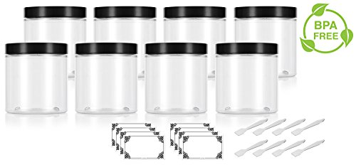 - Includes 8 - 8 oz / 250 ml Clear PET BPA Free Plastic Jars + spatulas and labels for each jar for optional use