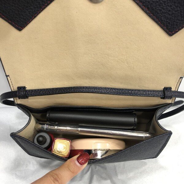 염소 가죽의 촉감과 결을 살린 고급스러운 소재에 자석 형식의 덮게, 외부 여분의 슬립 포켓과 1개의 탈부착 가능한 미니 지갑으로 구성.