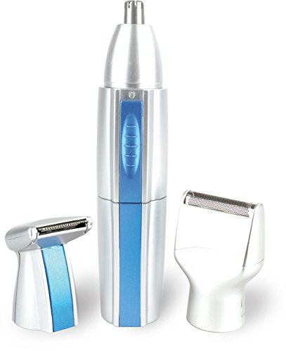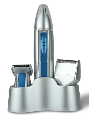 - EASY TO USE CORDLESS 3 IN 1 GROOMING SET WITH STAND - 3 IN 1 hair cutting kit includes interchangeable side burn trimmer, nose hair trimmer, and shaver for men or women. Is cordless, battery operated, small, compact, and can be carried easily in your pocket, purse, briefcase, bag or anywhere else. This cordless trimmer includes a Blade Brush for cleaning the unit any time.