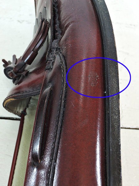 左 履き口付近にレザー擦れ、後ろ部分に白い汚れあり。