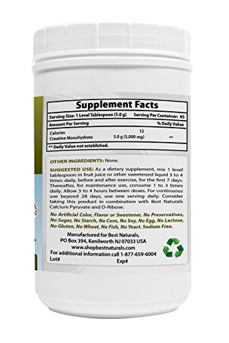 -. Binding : Health and Beauty -. Brand : Best Naturals -. EAN : 0817716015019 -. Feature : ATP Energizer / 100% Pure Powder / Enhances Muscle Perfomance / Accelerates power & recovery from excercises / All Best Naturals products are manufactured in accordance with Good Manufacturing Practices (GMP), among the highest standards in the world -- Proudly Made in USA -- Purity & Potency Guaranteed -. IsAdultProduct : 0 -. Label : Best Naturals -. Manufacturer : Best Naturals -. MPN : 817716015019 -. PackageQuantity : 1 -. PartNumber : 817716015019 -. ProductGroup : Health and Beauty -. ProductTypeName : HEALTH_PERSONAL_CARE -. Publisher : Best Naturals -. Studio : Best Naturals -. Title : Best Naturals Creatine Monohydrate 1 Lb Pure Powder -. UPC : 817716015019