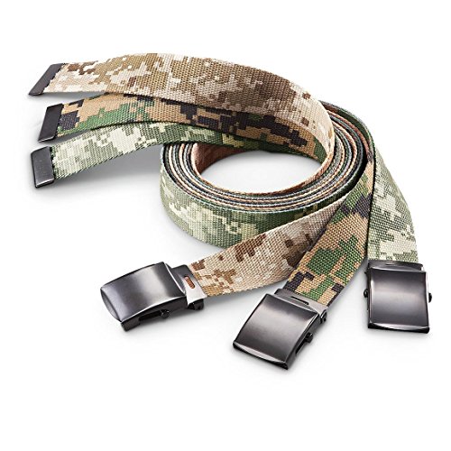 Studio : BRAND NOT SPECIFIED Publisher : BRAND NOT SPECIFIED Product Description Pack of military belts with real camo style. This pack of three Military-style Digital Camo Military Surplus Web Belts are up to army grade standard. They are made of an extremely tough web material meant to hold up in the harshest of conditions and through the most vigorous of activity. The brass roller buckle keeps the belt from sliding off and are fully adjustable up to a 50" waist. The belts measure at the military standard 1 1/4" wide. In this pack, you get one of each of the classic camo patterns: Digital Desert, Digital Woodland and Army Digital. The belts are easily cleaned by machine washing and drying. 50/50 cotton/polyester; Tough web material; Brass roller buckle; You get one of each camo pattern: Digital Desert, Digital Woodland and Army Digital; 1 1/4 Wide; Adjustable to fit up to a 50 waist; Trim to custom fit; Machine wash / dry; Imported; Order these military grade belts today! Military-Style Digital Camo Adjustable Web Belts 0