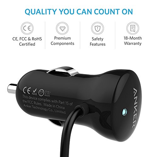 - Feature : The Anker Advantage: Join the 10 million+ powered by America's #1 USB Charging Brand. / Fastest Charge: 2.4 amps of power charges your iPhone, iPad or iPod as fast as possible. / Certified Safe: Anker's MultiProtect safety system ensures complete protection for you and your devices. 12 / 24 volt input voltage. / Incredibly Compact: One of the smallest car chargers on the market. / What You Get: Anker 12W Car Charger with built-in 3ft Lightning Cable, welcome guide, our fan-favorite 18-month warranty and friendly customer service.