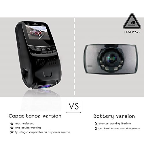 -. Feature : Capacitor Based Model - Uses a Capacitor as its power source - no internal battery. You need plug the car charger while use it / Dual lens design: 170° wide front camera+120° waterproof rear camera. Built in night vision, Loop recording, motion detection, G-sensor function / Made of Novatek NT96655 Chipset + Aptina AR0330 Lens - Provides low power consumtion, but high definition video compression and smooth imaging / Sest set the "motion detection"/ "G-sensor" function "OFF" while driving your car / Micro SD card capacity: 8G~32G (Not Include), SD card requirements:CLASS10. Please format your micro SDcard before record it