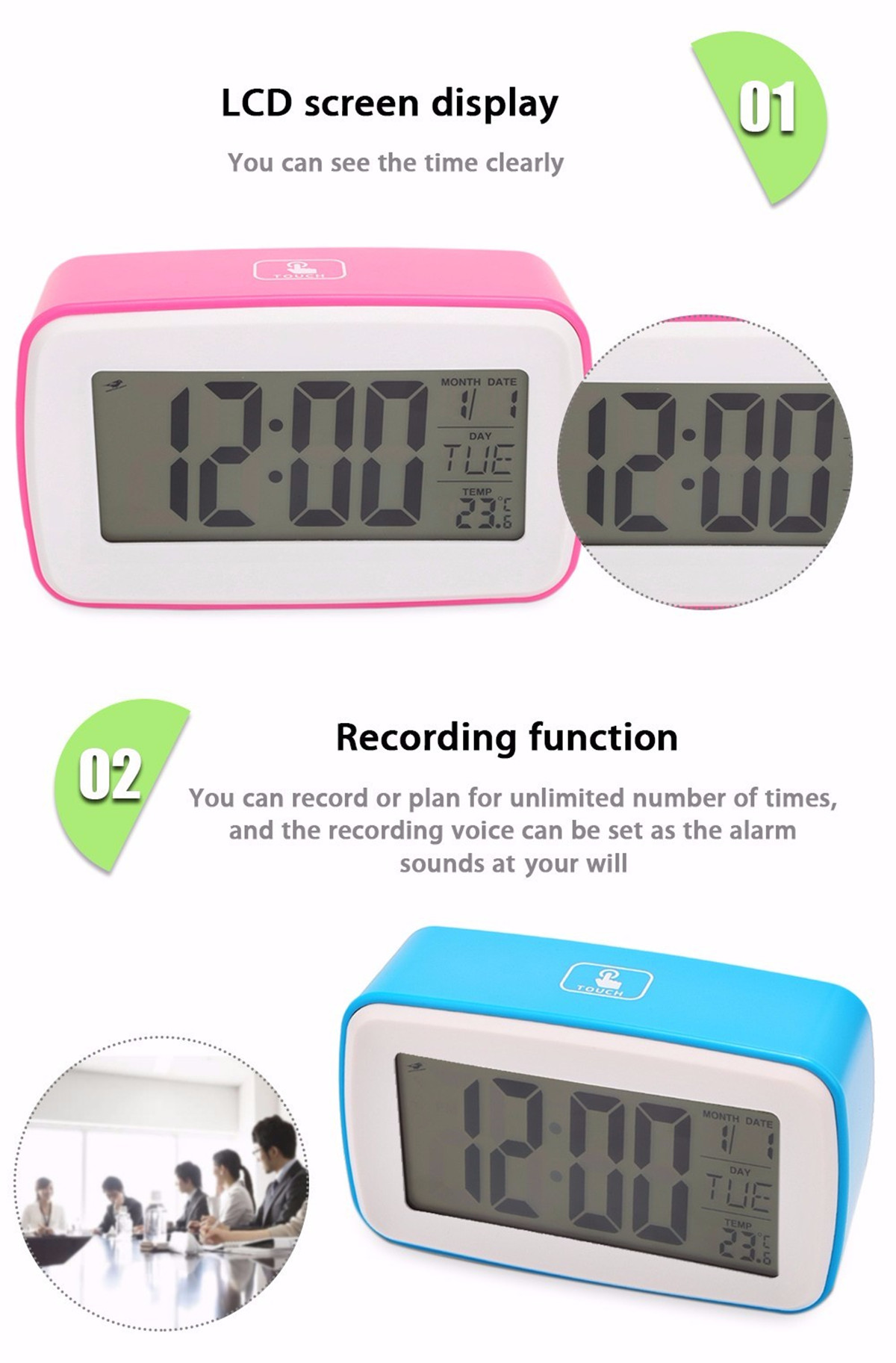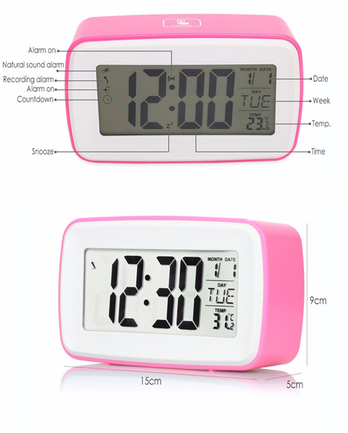 标题:多功能触摸数字贪睡闹钟个性化录音时钟液晶屏幕与日期温度