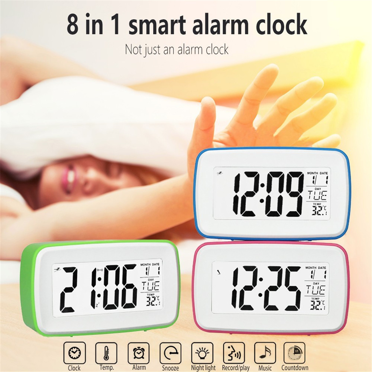 Smart clock function: turn on the sensor, back light automatically comes on when it's dark around. It can also be closed. If bright light is needed, just touch it, and it will light up for about 10 seconds. You won't worry about getting up at night