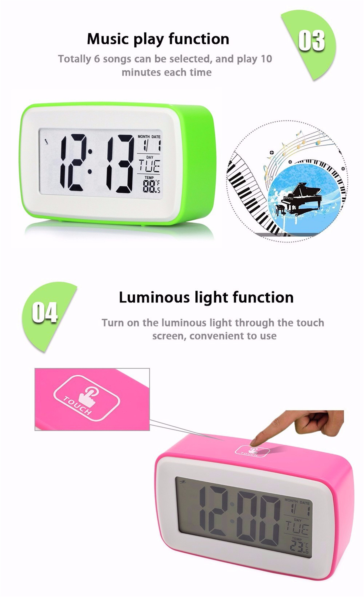 Luminous light function: turn on the luminous light through the touch screen. You can see the time clearly at night and it does no harm for your eyes