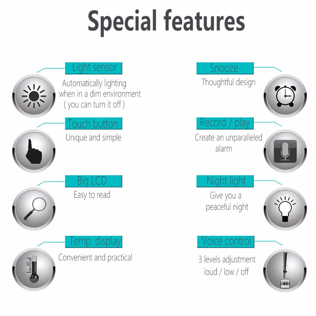 Recording and playing function: Can record or plan for unlimited number of times, and the recording voice can be set as the alarm sounds at your will. It can record for 10 seconds at most
