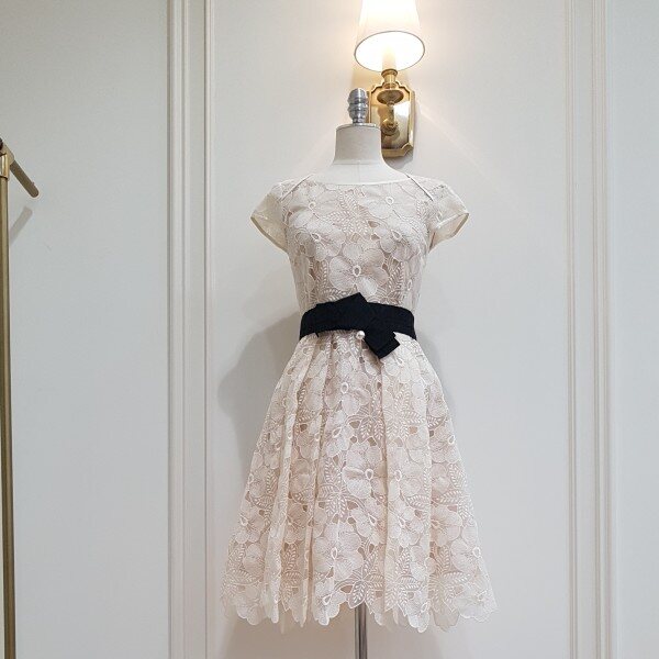 여성스럽게 연출 가능한 여름 원피스 여성스러운 플라워 레이스소재의 여름원피스입니다.레이스 라인을 살린 밑단과 리본벨트로 포인트를 주었습니다.허리의 턱주름이 언발란스한 스타일입니다.