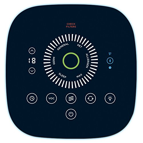 -. Feature : Great for Large Rooms - filters and circulates the room air up to 5X per hour when used in the recommended room size 16' x 16' (260 sq. ft.) / Permanent washable filter captures up to 99.9% of airborne particles as small as 0.1 micron, from the air that passes through the filter / Works with Bluetooth smart V4.0 compatible Apple and Android mobile devices or can also be operated manually / Features include: touch screen controls with 6 air cleaning levels, VOC sensor and visual display with auto setting, 1-18 hour auto-off timer, and a filter clean/pre-filter replacement indicator / Set custom operating schedules and access additional functions within the app such as allergen alert settings, allergen auto set, and a proximity sensor
