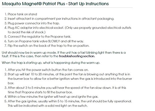 The Mosquito Magnet Patriot Plus is easy to use. Just plug it in, push the button, relax and enjoy your yard! The provided 50-foot, 12V power cord allows placement away from the family area yet near the mosquitoes' breeding and resting areas. Lawn clips are provided to help secure the power cord. Through proper placement upwind, the biting insects will be drawn to the trap, thereby reducing the chances of you becoming their target. The heavy-duty plastic and marine grade metals make it ideal for harsh environments. The enhanced Mosquito Magnet Patriot Plus has been designed for the homeowner who needs to protect up to a 1 acre area. For optimal results, run your trap 24 hours a day in order to break the mosquitoes' breeding cycle. Your trap will begin working immediately with noticeable results in 7-10 days. Allow 4 weeks to see significant results. As with the other Mosquito Magnet traps, the Patriot Plus uses our patented CounterFlow Technology. This technology allows the trap to emit a precise plume of CO2, heat, and moisture that attracts the biting insects to the trap, while simultaneously vacuuming them into a net where they dehydrate and die within 24 hours. The Mosquito Magnet mimics a large mammal by emitting a plume of carbon dioxide, heat and moisture, which when combined with an additional attractant, Octenol or Lurex3, becomes irresistible to mosquitoes, no-see-ums, biting midges, black flies and more. By using one of these approved Mosquito Magnet attractants, you will be able to increase your catch rate up to 10X.Feature